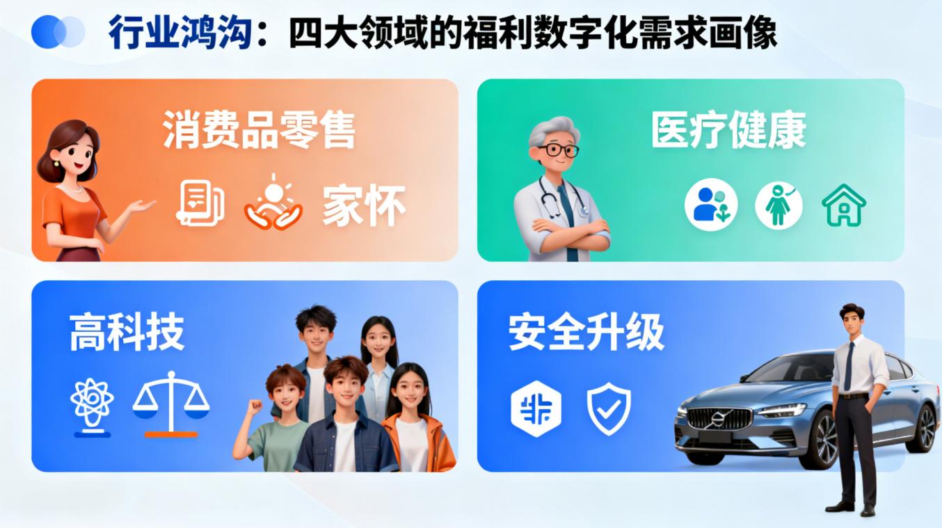 不同行业的员工结构、职业风险与需求痛点天差地别,直接决定了福利数字化的落地逻辑。我们结合消费品零售、医疗健康、高科技、汽车四大典型行业的实践数据,勾勒其核心需求画像: